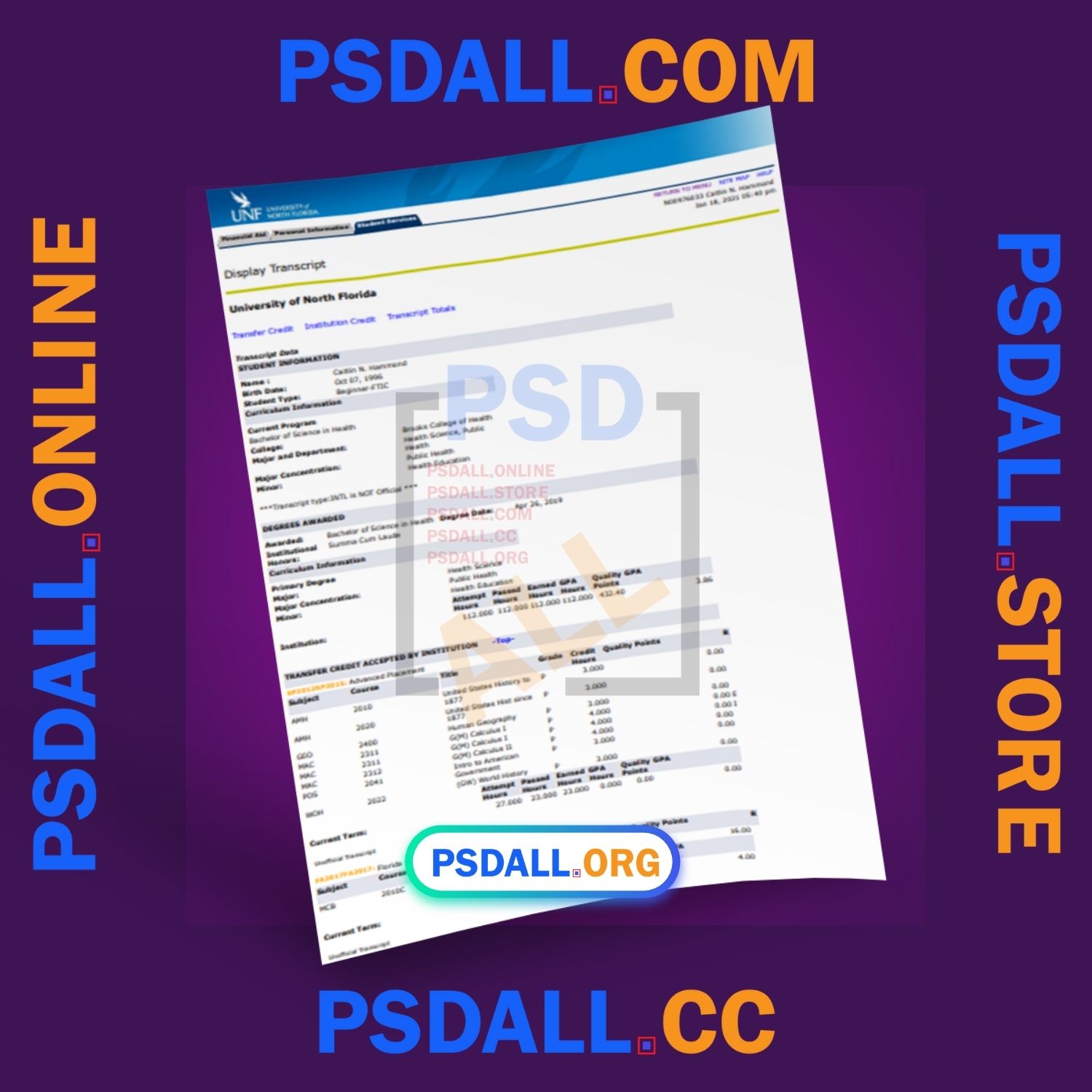University of North Florida Transcript Template in PDF Format at the best price.